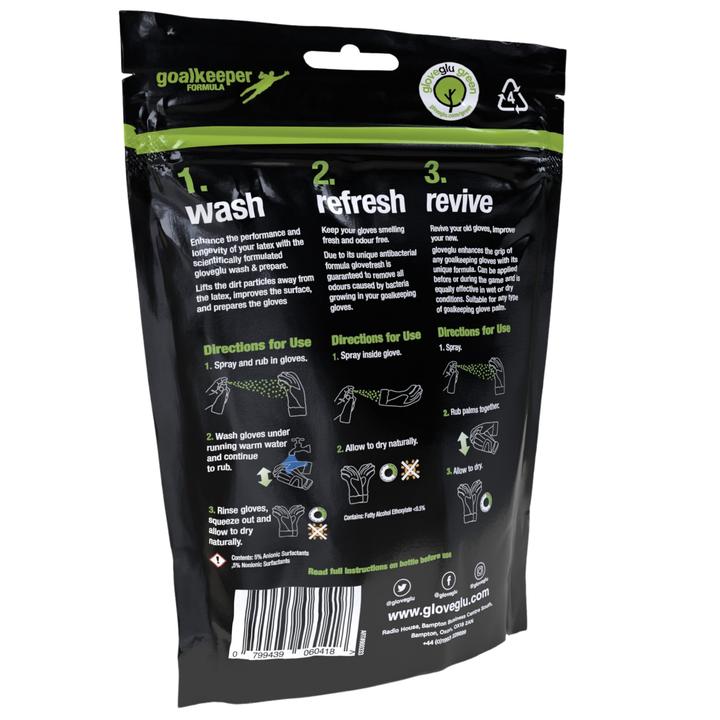 REVIVE: GLOVEGLU 120ML Revive your old gloves. Improve your new. gloveglu enhances the grip of any goalkeeping glove with its unique formula. Can be applied before or during the game and is as equally effective in wet or dry conditions. Suitable for any type of goalkeeping glove palm.